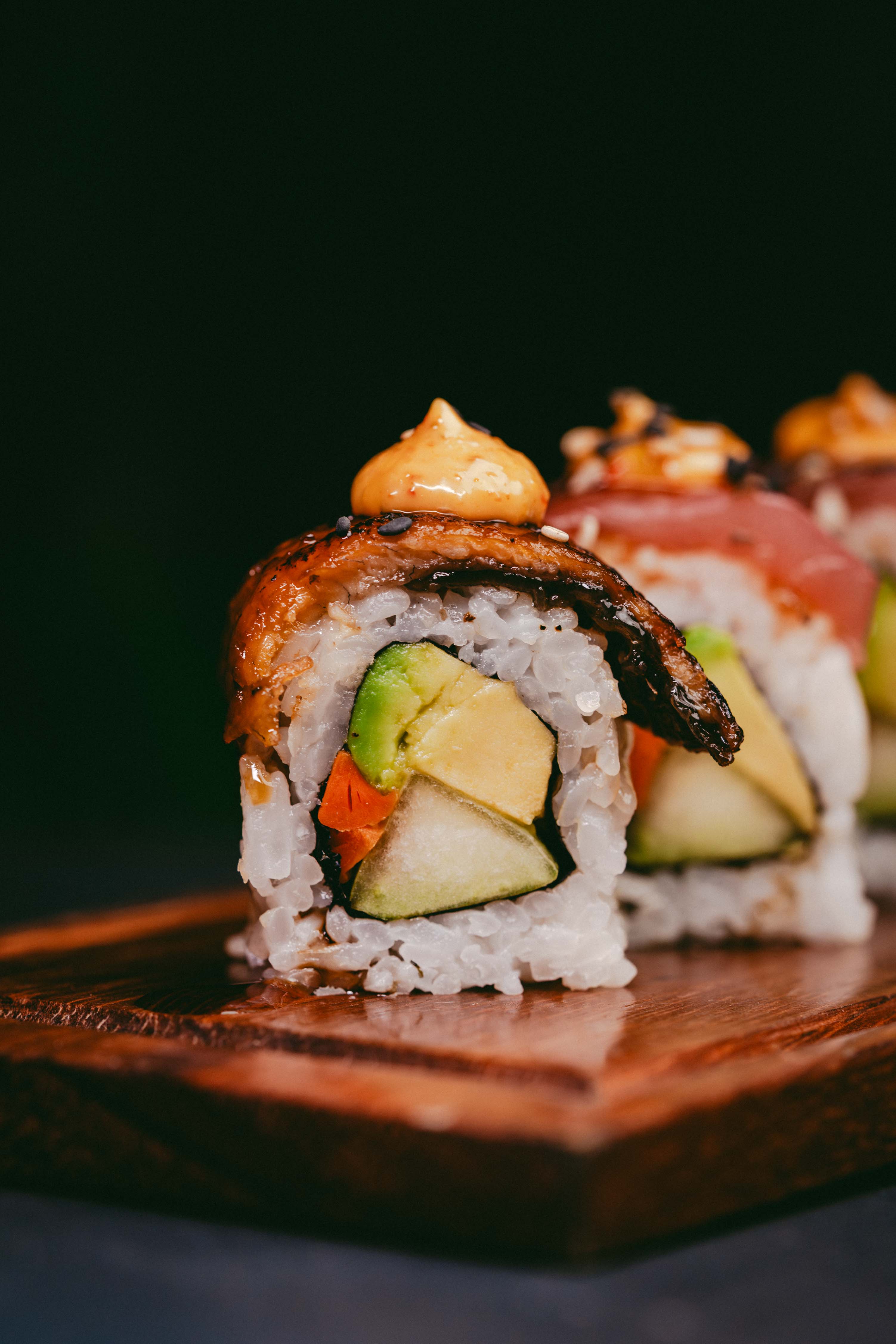 Nori, shari, atún, anguila, yamagobo, pepino, aguacate, mayonesa spicy, sriracha y salsa de anguíla.